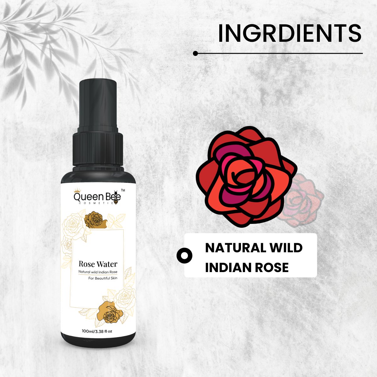 • 🌹 100% PURE & NATURAL : Queen Bee Cosmetic Rose water is completely pure, natural and sourced, which is famous for cultivating finest natural wild indian rose. Absolutely ZERO Additives & Alcohol. Naturally hydrate, revitalize & moisturize your skin for a refreshed look. Works perfectly as a makeup setting spray & natural makeup remover.